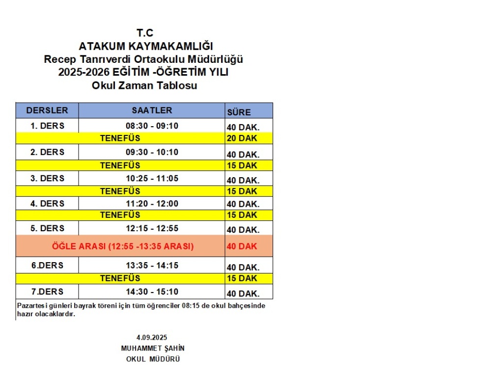 2025-2026 EĞİİTM ÖĞRETİM YILINDA OKULUMUZ ZAMAN ÇİZELGESİ EKTEKİ GİBİ UYGULANACAKTIR.